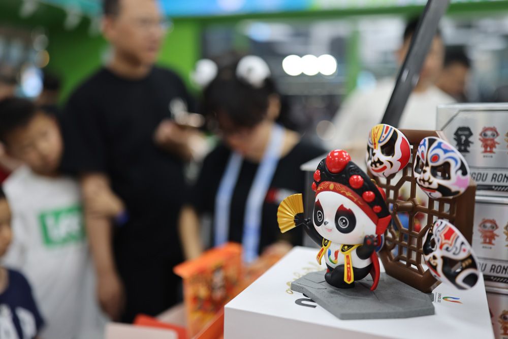 7月20日,四川成都,第31届世界大学生夏季运动会官方特许商品零售店内,能够演示“川剧变脸”的吉祥物“蓉宝”手办被放在显要位置展示。图/中新社