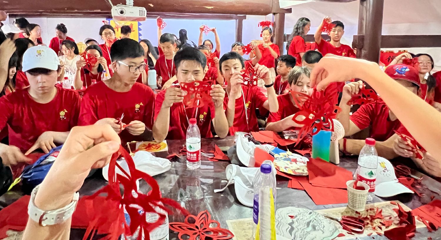 7月24日,山西晋中,2023年“中国寻根之旅”夏令营山西太原营的营员们体验剪纸制作工艺。图/中新社