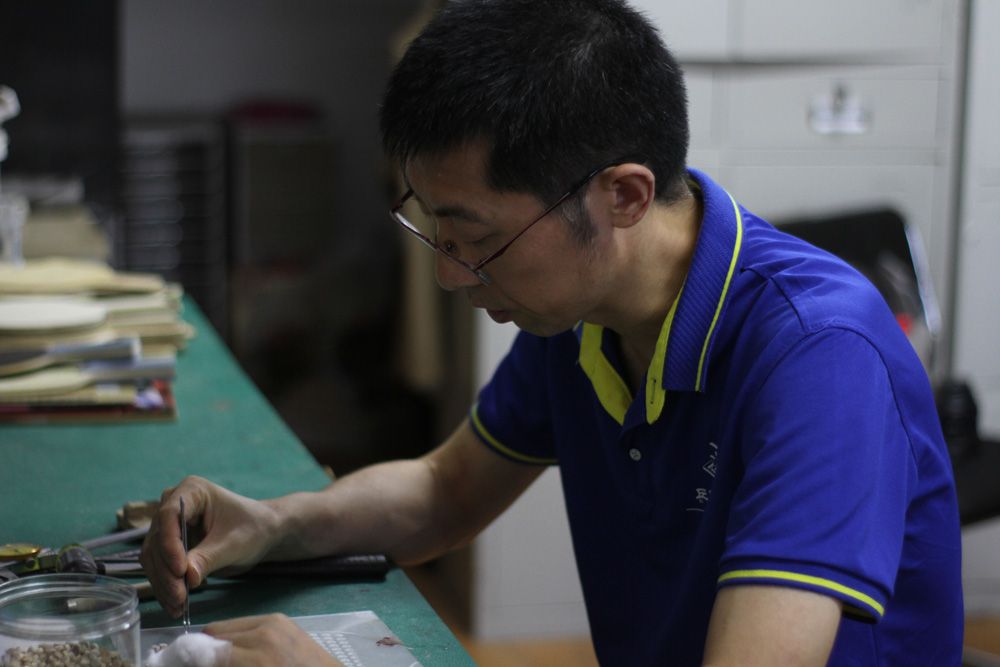 7月25日,位于四川成都的乒匠研创工作室内,46岁的负责人吴伟在简易的条桌前工作。图/中新社