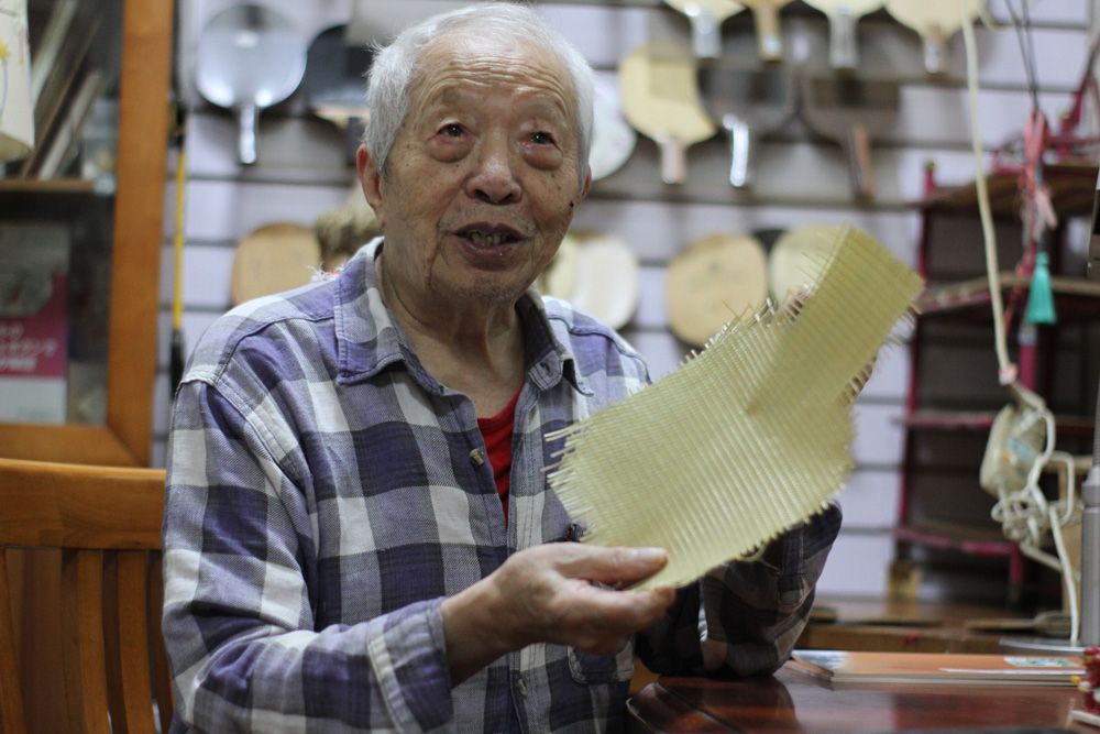 7月25日,四川成都,87岁老工匠曹立熹在家中向来访者演示竹编纤维。图/中新社