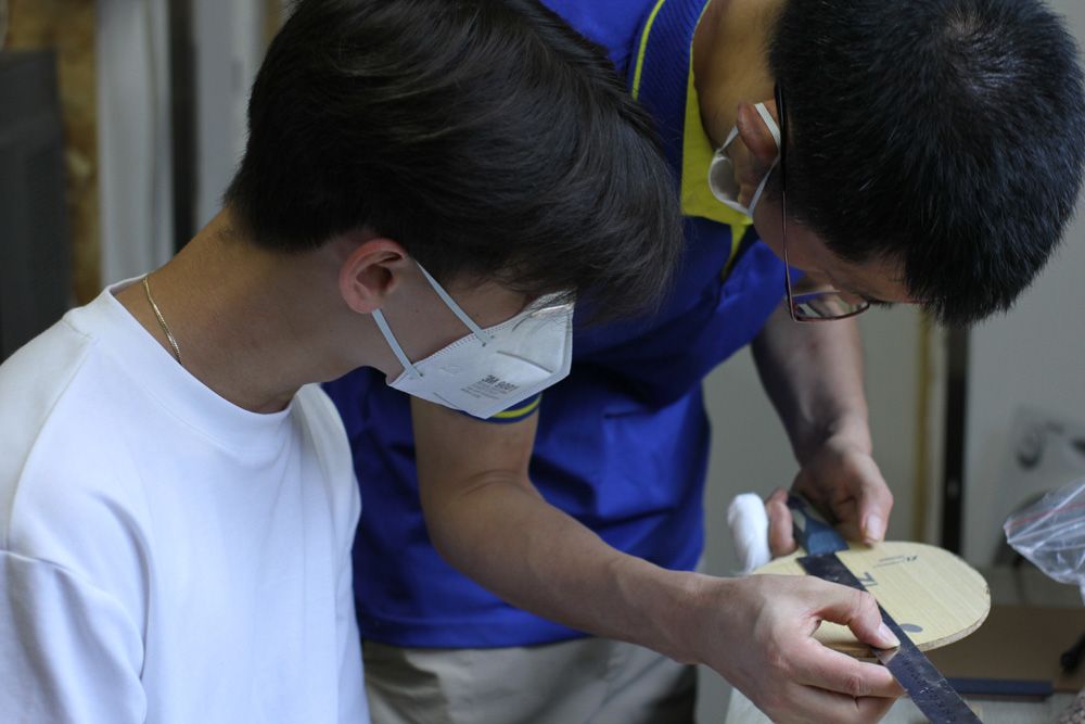 7月25日,来自芬兰的乒乓球运动员王子昂来到乒匠研创工作室定做球拍底板。图/中新社