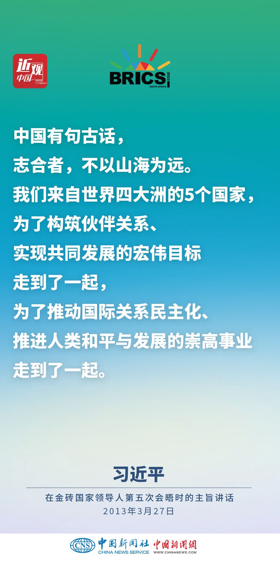 志合者,不以山海为远。从2006年金砖机制建立以来,在金砖五国的共同努力下,合作成果丰硕,已经成为推动全球治理的重要合作平台。党的十八大以来,习近平主席多次在金砖国家合作平台上发出“中国声音”,在金砖合作进程中留下深刻的“中国印记”。