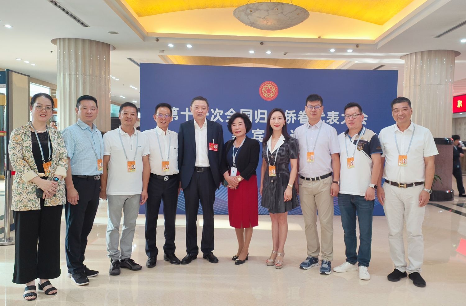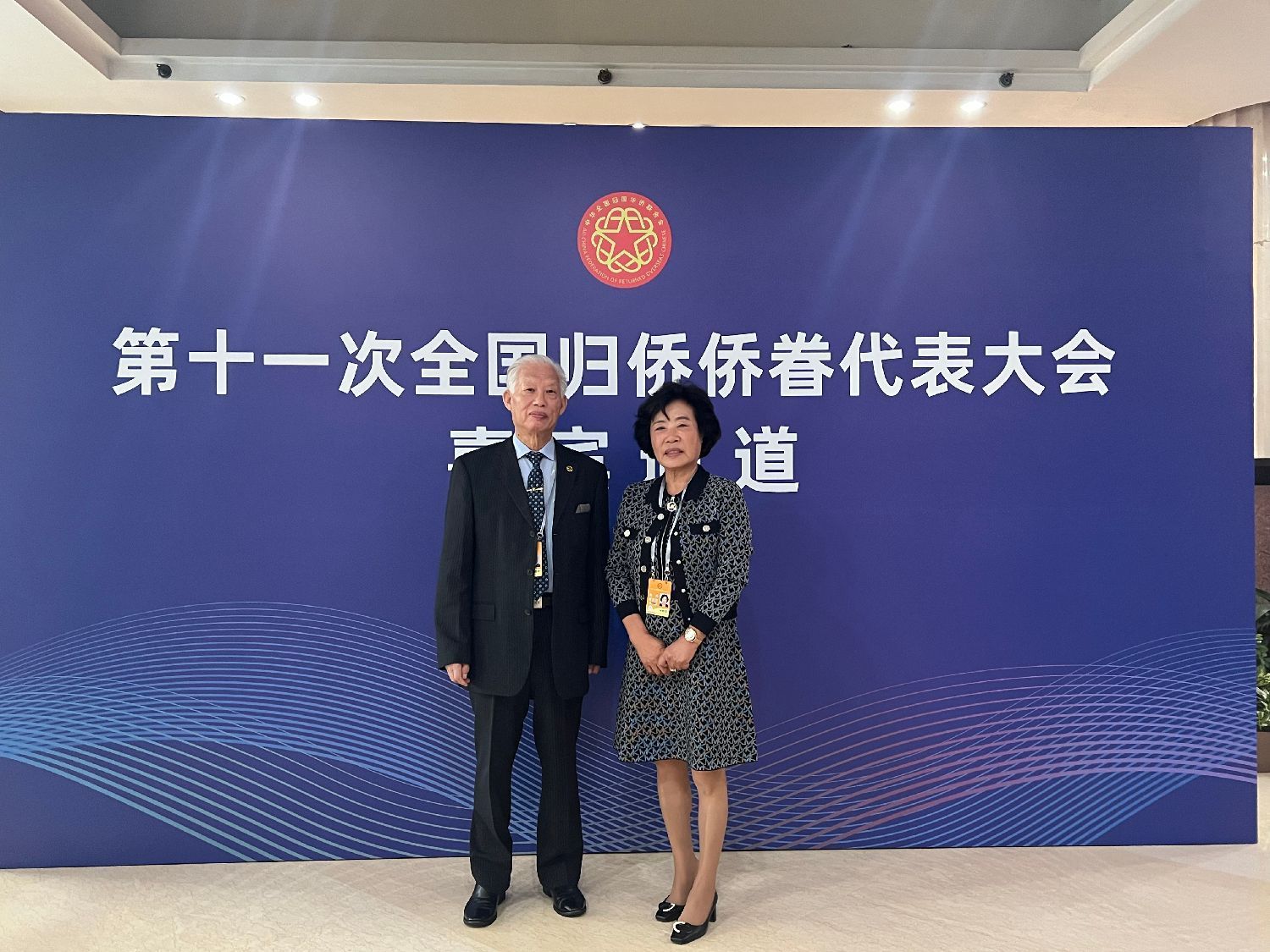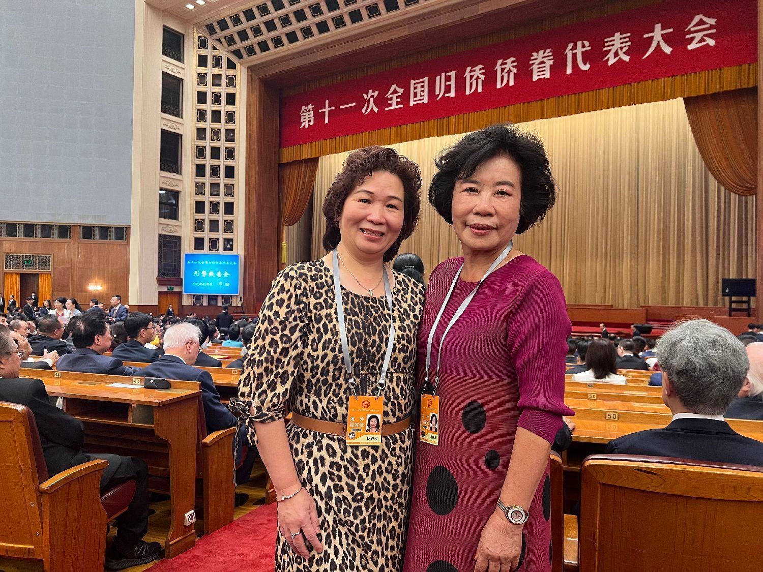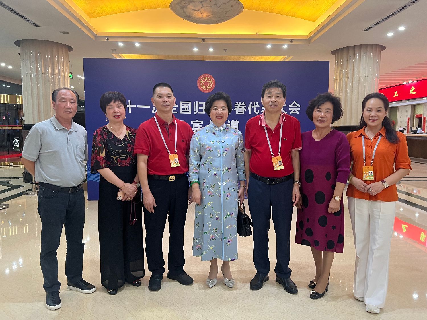 人民大会堂大礼堂气氛庄重而热烈。主席台上方悬挂着“第十一次全国归侨侨眷代表大会”的会标,后幕正中是象征着五大洲侨胞心向祖国的中国侨联会徽,10面红旗分列两侧。二楼眺台悬挂着“以习近平新时代中国特色社会主义思想为指导,全面贯彻党的二十大精神,团结凝聚广大归侨侨眷和海外侨胞为全面建设社会主义现代化国家、全面推进中华民族伟大复兴而奋斗!”巨型横幅。来自全国各地的近1200名归侨侨眷代表和来自100多个国家的近600名海外侨胞特邀嘉宾欢聚一堂。