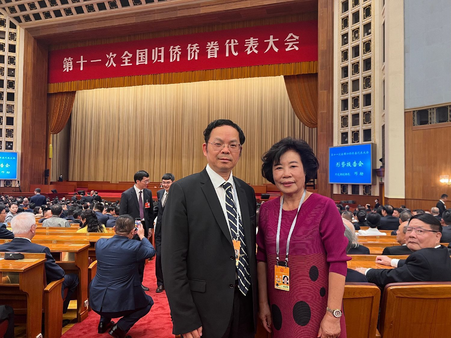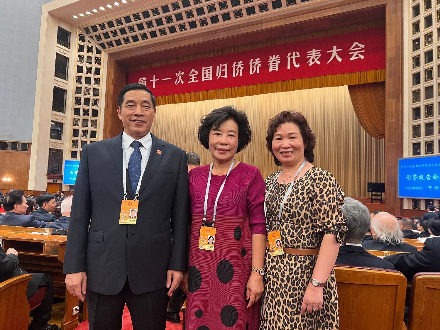 欧洲华侨华人妇女联合总会主席、匈牙利华侨华人妇女联合总会会长林胜琴(中),匈牙利华侨华人社团联合总会主席、匈牙利中国和平统一促进会会长余美明(左)出席第十一次全国归侨侨眷代表大会。