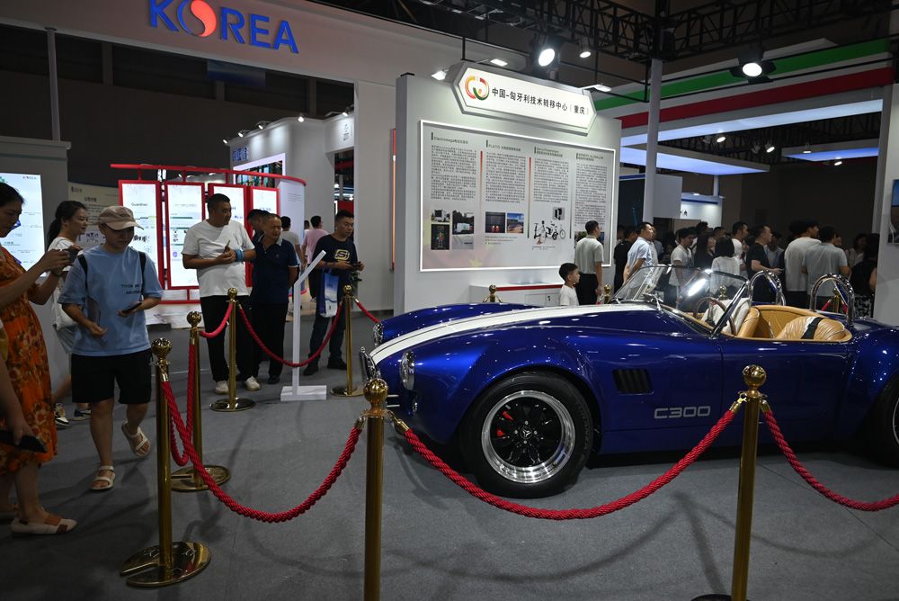 9月4日,2023智博会在重庆举行,匈牙利展商带来的全电敞篷跑车吸引市民围观。图/中新社