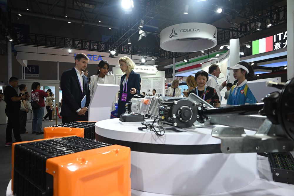 9月4日,2023智博会在重庆举行,外国展商带来的新能源汽车零部件吸引众人关注。图/中新社