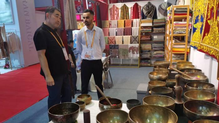 “颂钵是尼泊尔代表性的手工制品,以往我们都是等着旅行的人来买颂钵作为纪念品。听朋友说起中国市场的广阔后,我决定不再等客人,而是来到进博会,把我们的东西介绍出去。”Luitel Santosh说道。