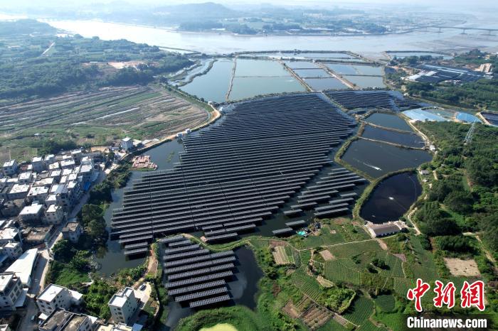 “渔光互补”是指渔业养殖与光伏发电相结合,在鱼塘水面上方架设光伏板阵列,光伏板下方水域进行鱼虾养殖,形成“上可发电、下可养鱼”的发电新模式。
