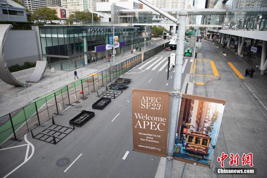 当地时间11月10日,行人从美国旧金山莫斯康中心周围的金属围栏旁经过。随着亚太经合组织(APEC)第三十次领导人非正式会议临近,作为会议场地的莫斯康中心附近出现金属围栏,执勤警察也大幅增加。中新社记者刘关关摄