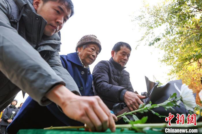图为南京大屠杀幸存者艾义英(中)在家人的陪同下献花。图/中新网