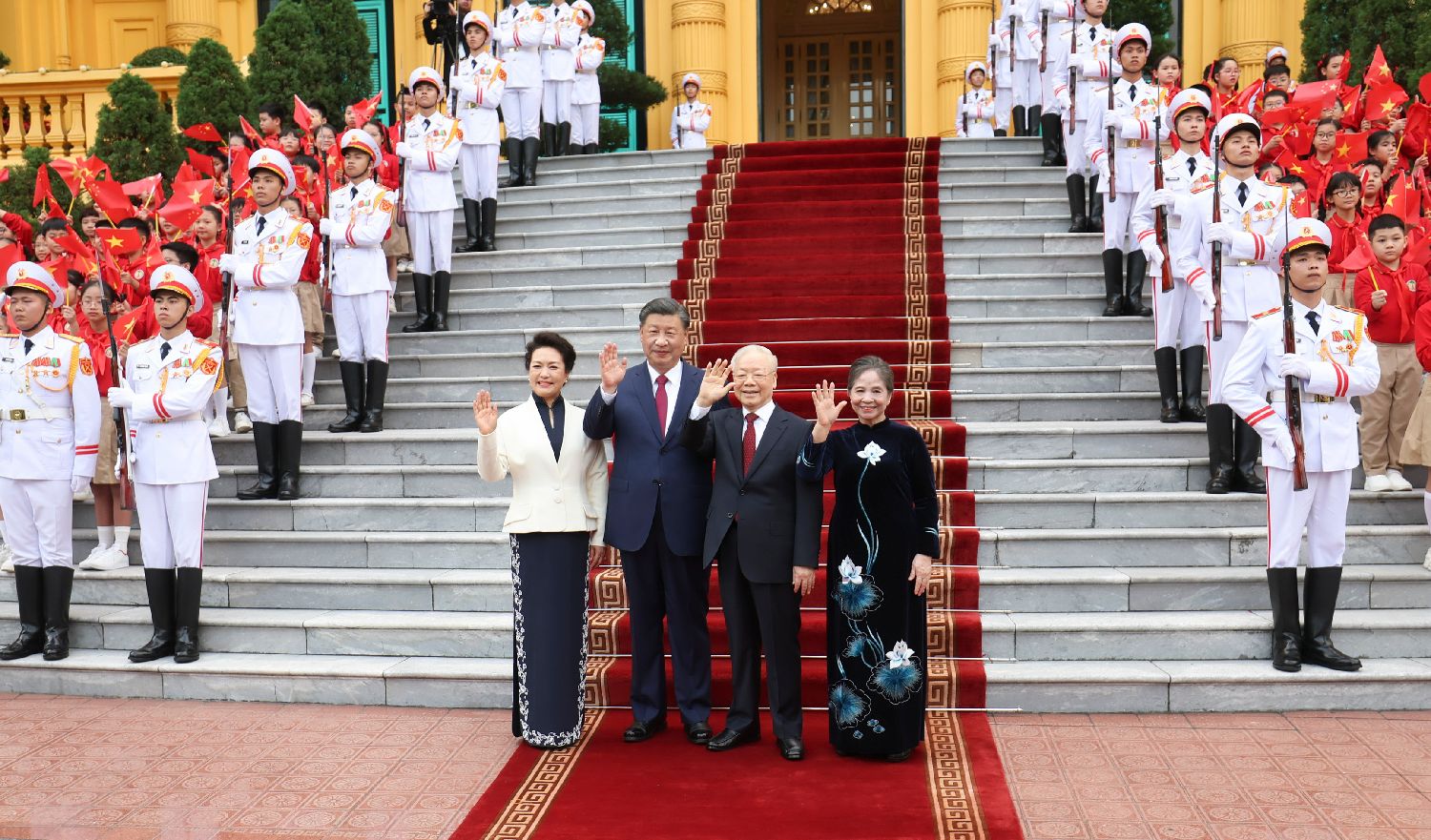 当地时间12月12日下午,刚刚抵达河内的中共中央总书记、国家主席习近平在越共中央驻地同越共中央总书记阮富仲举行会谈。这是阮富仲在主席府广场为习近平举行隆重欢迎仪式。图/新华社