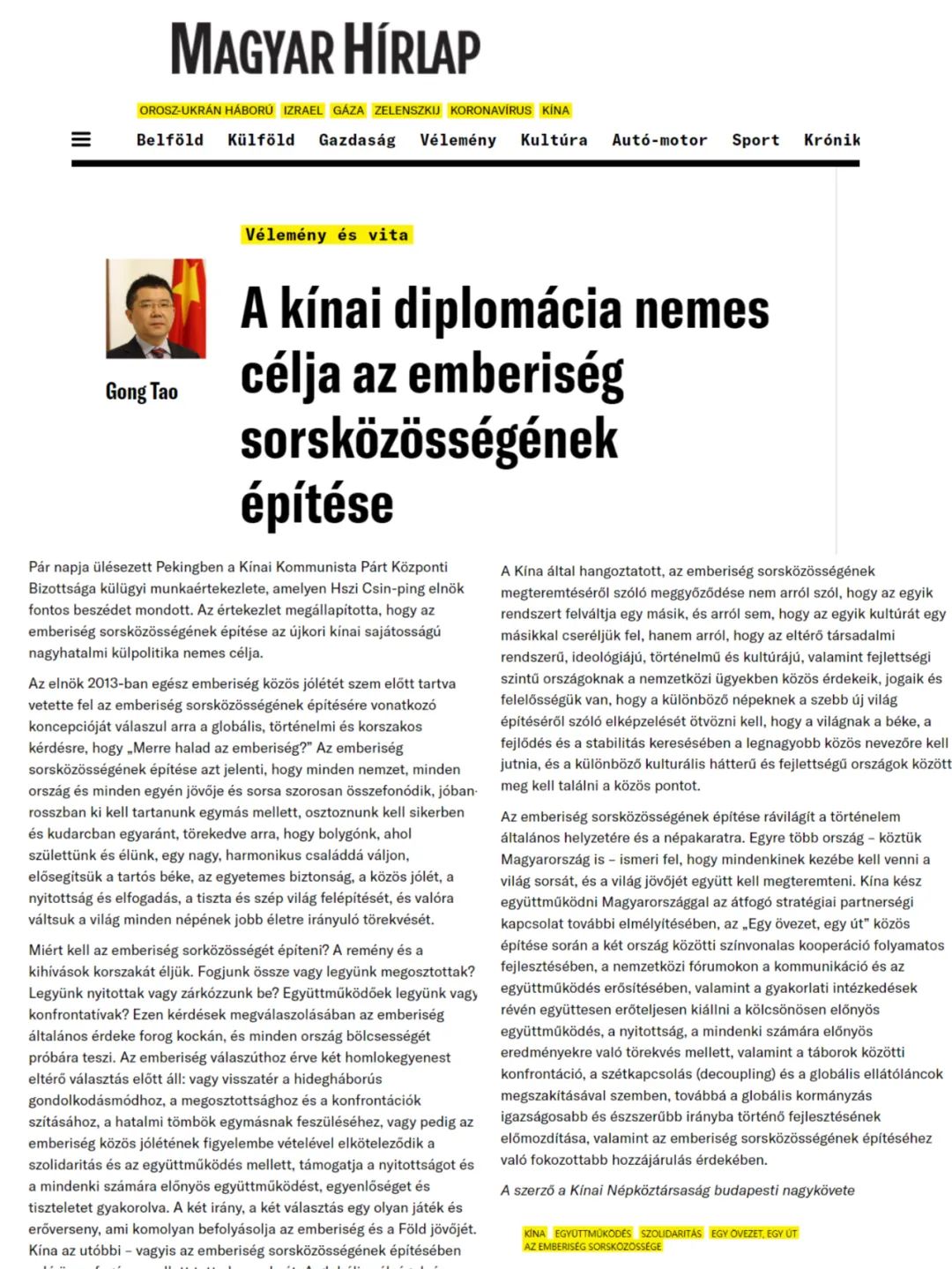 2024年1月10日,驻匈牙利大使龚韬在《匈牙利新闻报》发表署名文章《构建人类命运共同体——中国外交的崇高目标》,宣介中央外事工作会议精神,全文如下: