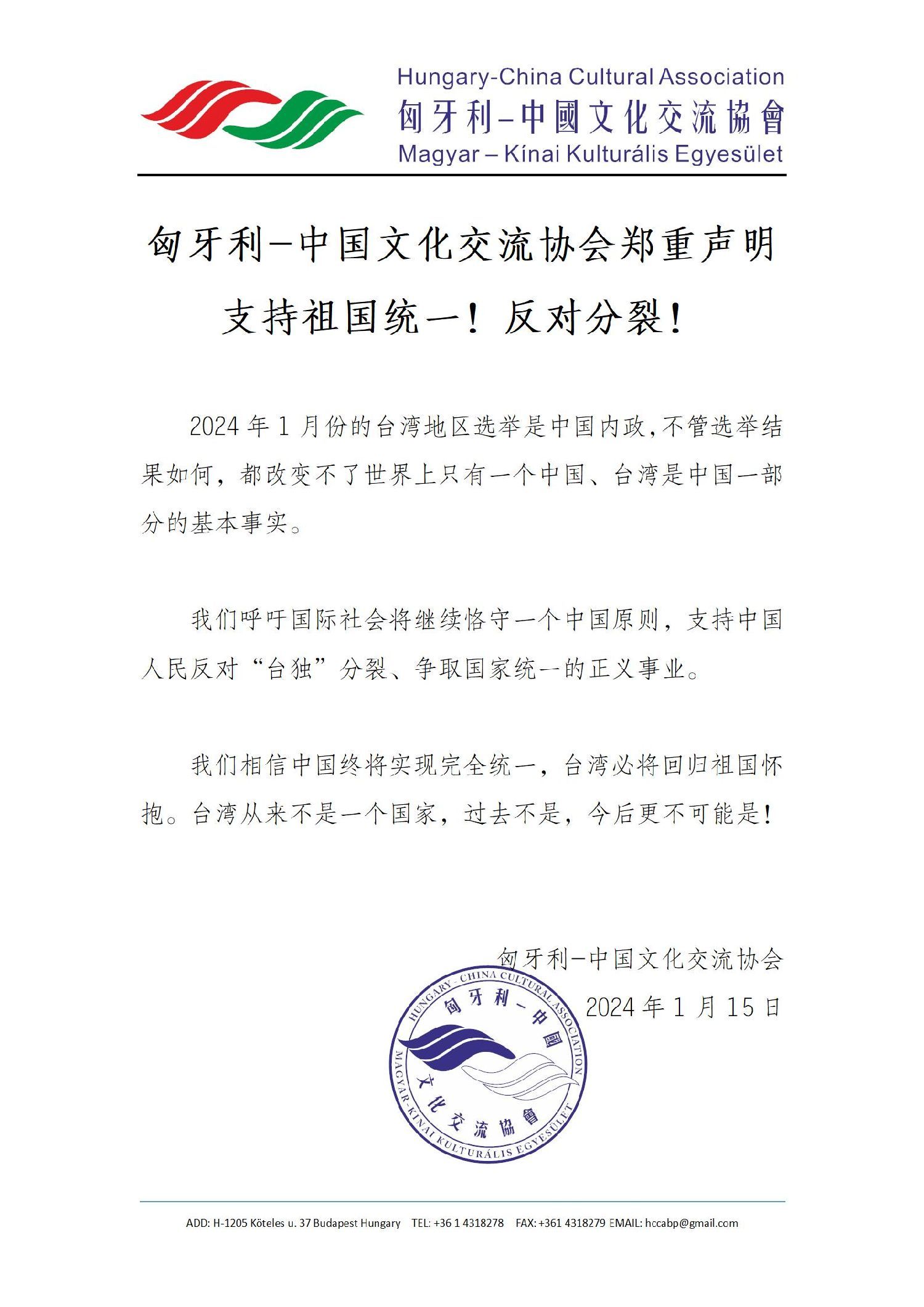 匈牙利-中国文化交流协会郑重声明:支持祖国统一!反对分裂!