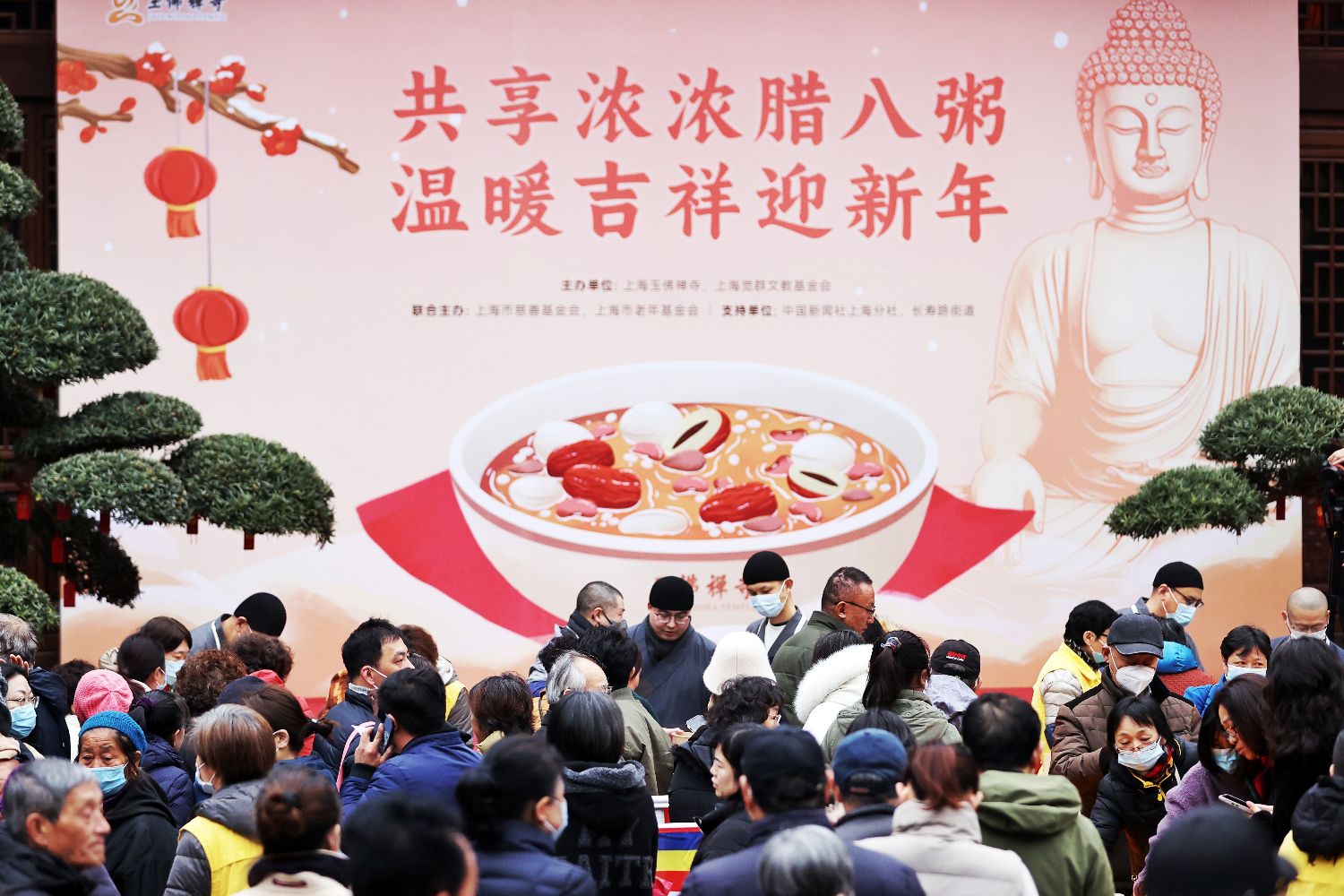 当日,上海百年古刹玉佛禅寺举行“共享浓浓腊八粥,温暖吉祥迎新年”腊八赠粥活动。一大清早,当地市民从四面八方赶来领粥。