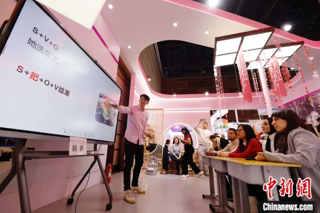 2023年12月,2023世界中文大会在北京举行,北京语言大学展台展示现场中文授课。