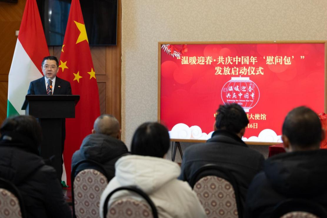 龚韬大使表示,党中央始终关心牵挂着海外同胞,将大家的平安幸福放在心上。年底慰侨是使馆的重要工作,我们为侨胞、留学生和企业务工人员精心准备了个性化的慰问物资,希望通过小小的“慰问包”,传递祖国的温暖和问候。同胞们远离祖国,扎根当地,经商求学,辛勤耕耘,在推进中匈友好、促进中外交流方面发挥着重要作用。今年是中匈建交75周年,双边关系发展面临新的机遇。不久前,中央外事工作会议胜利召开,全面总结新时代中国特色大国外交的历史性成就和宝贵经验,深刻阐述新征程对外工作面临的国际环境和肩负的历史使命,对当前和今后一个时期的对外工作作出全面部署。我们要高举构建人类命运共同体的光辉旗帜,把中国人民的利益和包括匈牙利在内的世界人民的利益进一步结合起来,推动世界走向和平、安全、繁荣、进步的光明前景,推动中匈全面战略伙伴关系迈上新台阶,共同构建中匈命运共同体。中国驻匈使馆将按照党中央的重要部署,秉持“以人民为中心”的执政理念,当好全体旅匈同胞的坚强后盾。祝全体旅匈同胞健康如意,龙年大吉。