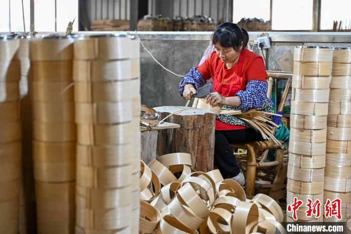 走进泗纶镇的蒸笼生产基地,清幽的竹香扑面而来。在遮阳棚下,编织好的蒸笼被围起来晾晒。旁边生产间内,工人们正对竹片切割,定型和打磨蒸笼。为了提高生产效率,基地通过机械对竹子去青皮和分片,提升加工速度。