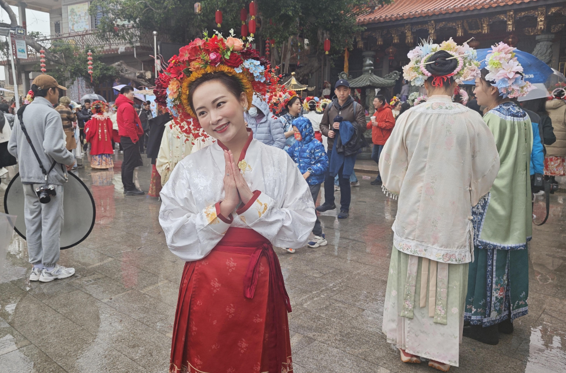1月29日,来自泰国的张爱玲走进蟳埔村,头戴蟳埔女“簪花围”拍照留念。图/中新社