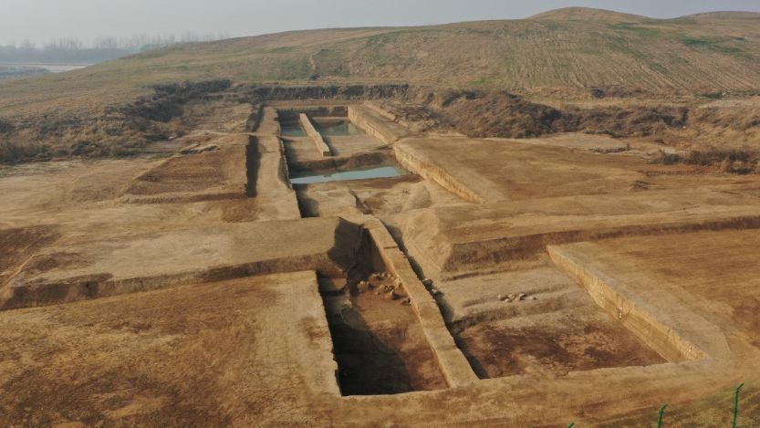 2021年12月,昆明池西岸出水口发掘。图/西安市文物保护考古研究院供中新社图