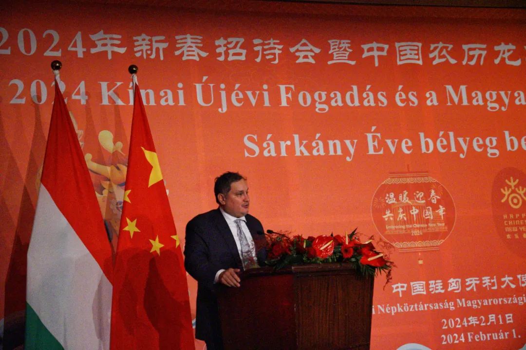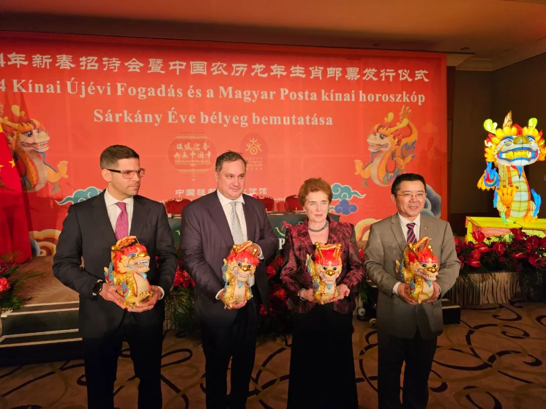 2月1日,驻匈牙利使馆举行2024年新春招待会暨中国农历龙年生肖邮票发行仪式,龚韬大使和匈政府代表、国民经济部部长纳吉出席并致辞。匈国会常务副主席玛特劳伊、副主席多洛、总统外事顾问奥尔图斯、外交与对外经济部副国务秘书希戴格、国防部副国务秘书豪伊尼克、国民经济部副国务秘书索尔诺基等匈政要及政府、国会、政党、军警、工商、文教、媒体等各界友好人士及在匈中资机构、华侨华人、留学生代表逾600人欢聚一堂。