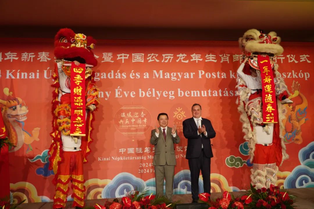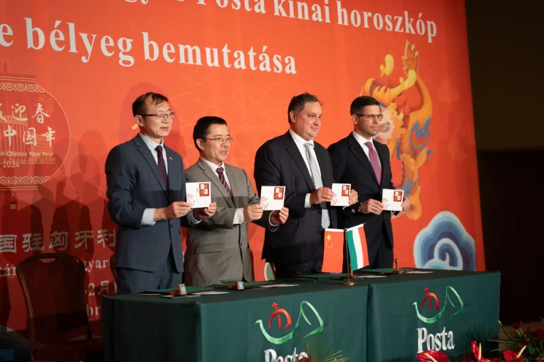 活动期间,龚韬大使、纳吉部长与匈邮政总公司总裁兼首席执行官鲍尔佐、布达佩斯中国文化中心主任金浩共同主持中国农历龙年生肖邮票首发仪式,并在首日纪念封上加盖邮戳和签名。这次发行的龙年生肖邮票也是匈牙利邮政总公司发行的第11枚中国农历生肖邮票。