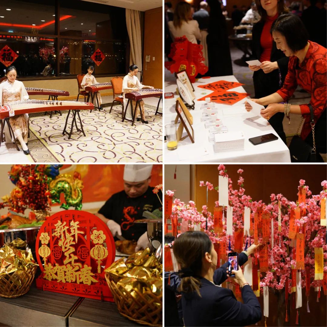 招待会上还进行中国传统舞狮表演,举办了古筝演奏、春节祈福、春联福字书写、雕版年画印制等富有中国传统文化特色的周边活动,吸引来宾们驻足观看、亲身体验。现场布置彰显了浓厚的节日气氛和生动的文化意蕴,在场来宾都对中国文化博大精深、丰富多彩的吸引力深表赞叹。