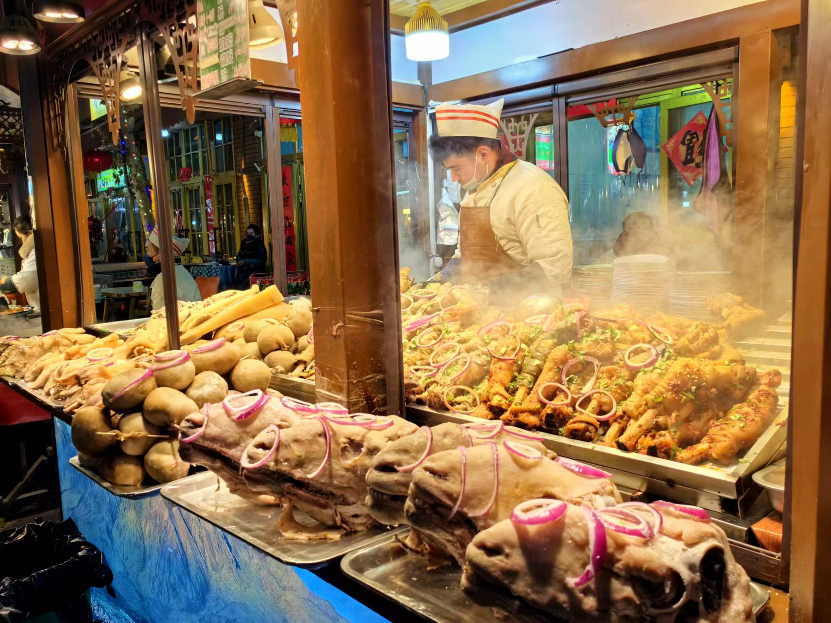 近日,努尔麦麦提·托合提准备好羊头、羊杂等新疆特色美食,以待顾客选购品尝。图/中新社