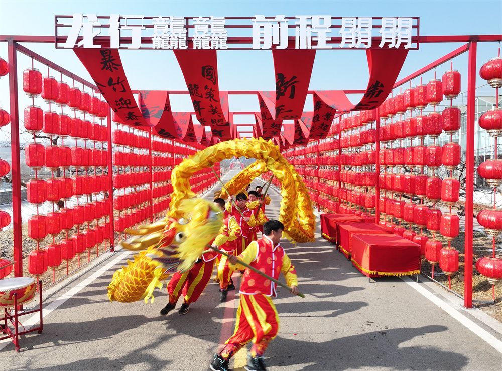 图为2月12日在河北省唐山市迁西县五海庄园景区拍摄的耍龙表演。图/新华社