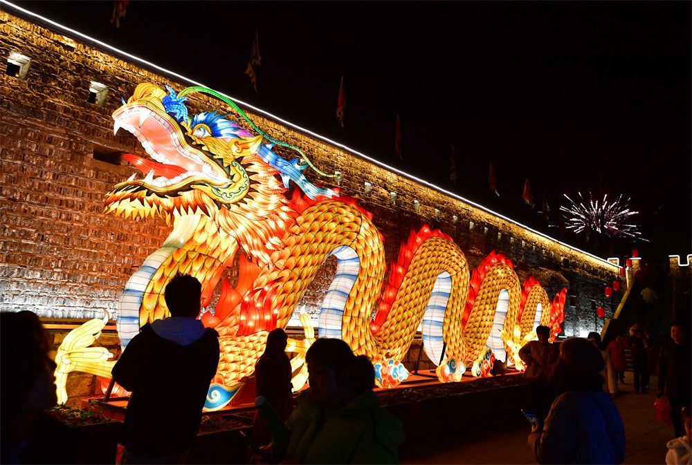 2月11日,游客在安徽省合肥市肥西县三河古镇景区观赏龙元素花灯。图/新华社