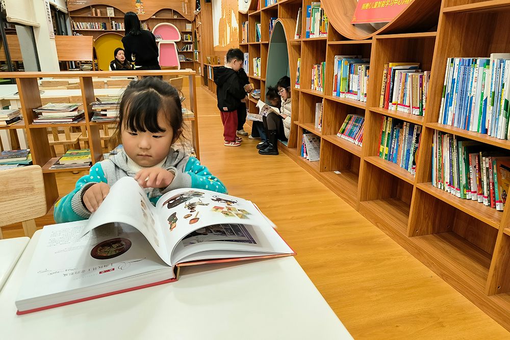 2023年12月22日晚,一位儿童在墨脱县莲花书屋翻阅画册,据悉该书屋有图书上万册,是西藏最大的县级书屋。图/中新社
