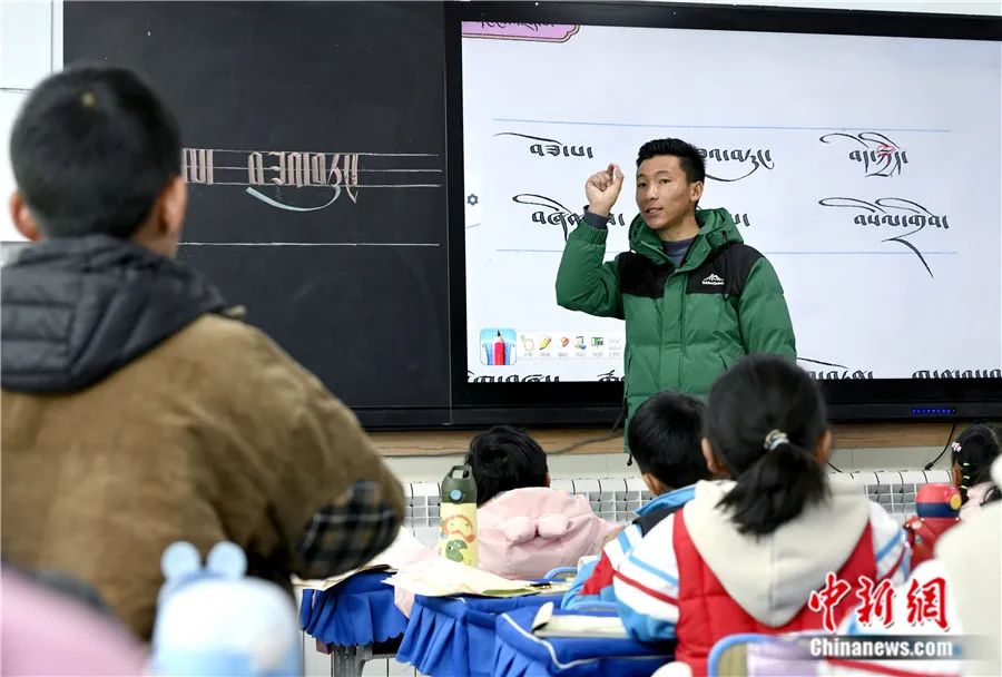 2023年3月14日,西藏拉萨市第一小学藏语文老师拉巴次仁在课堂提问。图/中新网