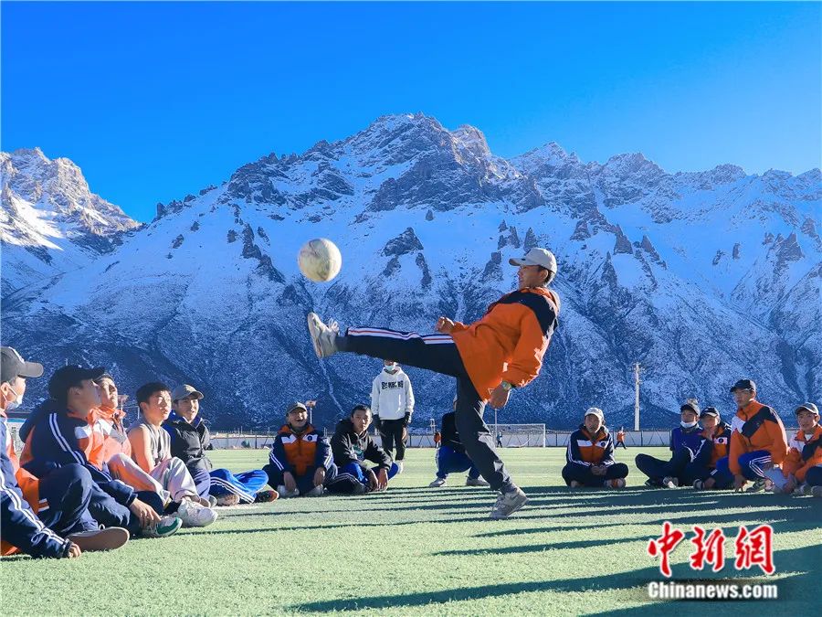 2022年11月25日,西藏那曲市嘉黎县中学的高原球场上学生们在进行足球训练。这座海拔4500米的高原球场是全校2500余名学生上体育课的地方,也是训练足球的场地。图/中新网