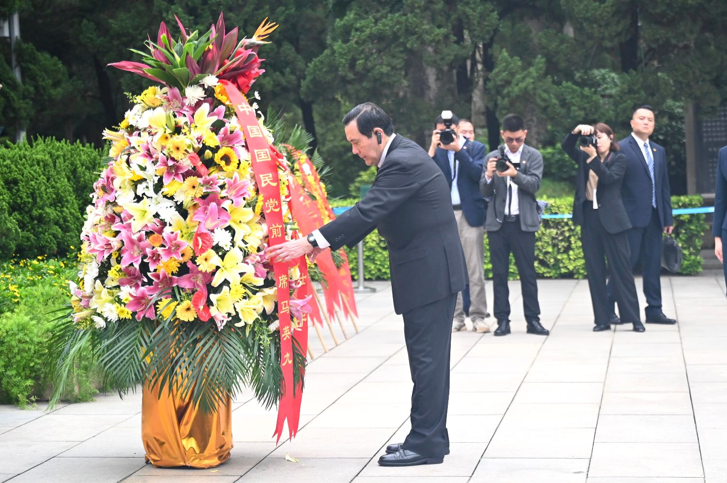 北京时间4月3日上午,中国国民党前主席马英九和台湾青年一行在广州拜谒黄花岗七十二烈士墓。图为马英九向墓碑敬献花篮。图/中新社