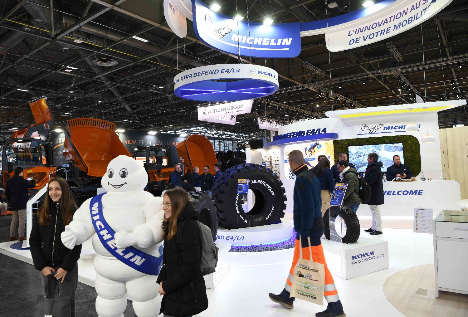 4月24日,2024年法国巴黎工程机械展(INTERMAT 2024)在巴黎北郊的维勒潘特展览中心开幕。图为欧洲知名的工程机械企业米其林的展台。图/中新社
