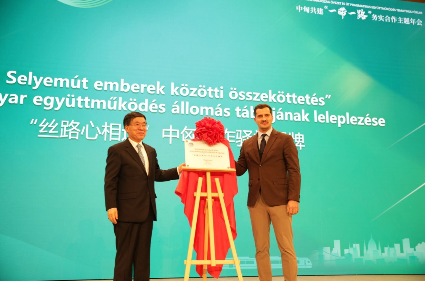 5月2日,在匈牙利首都布达佩斯,中国国际交流协会副会长、中联部前副部长刘洪才和欧中“一带一路”文化、教育、旅游和经贸发展委员会代表维克多·韦雷布为“丝路心相通”中匈合作驿站揭牌。(主办方供图)
