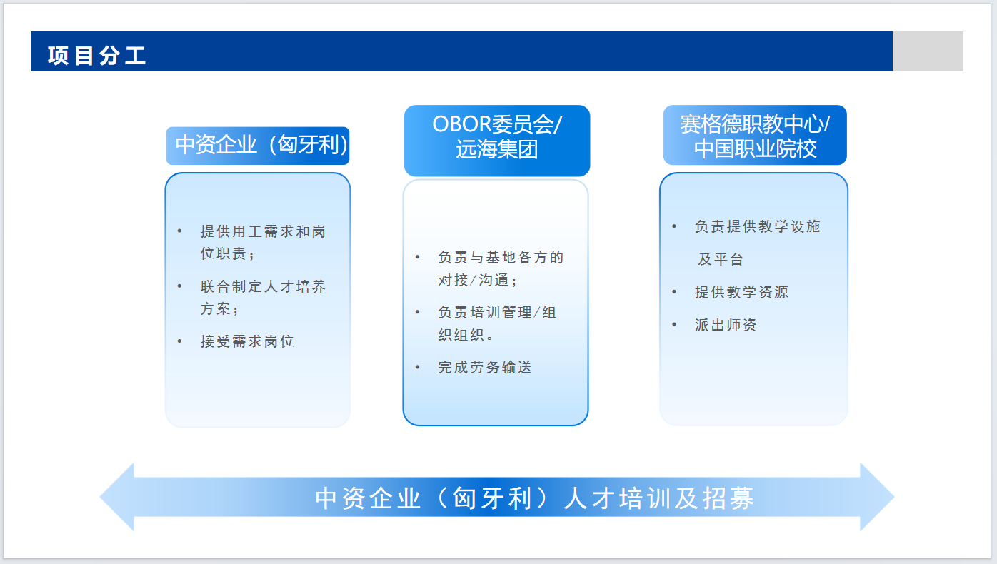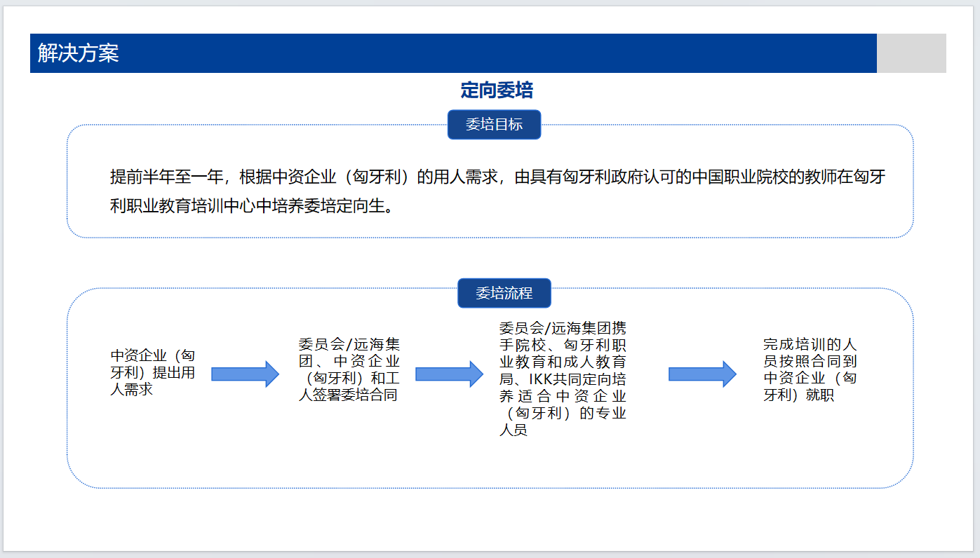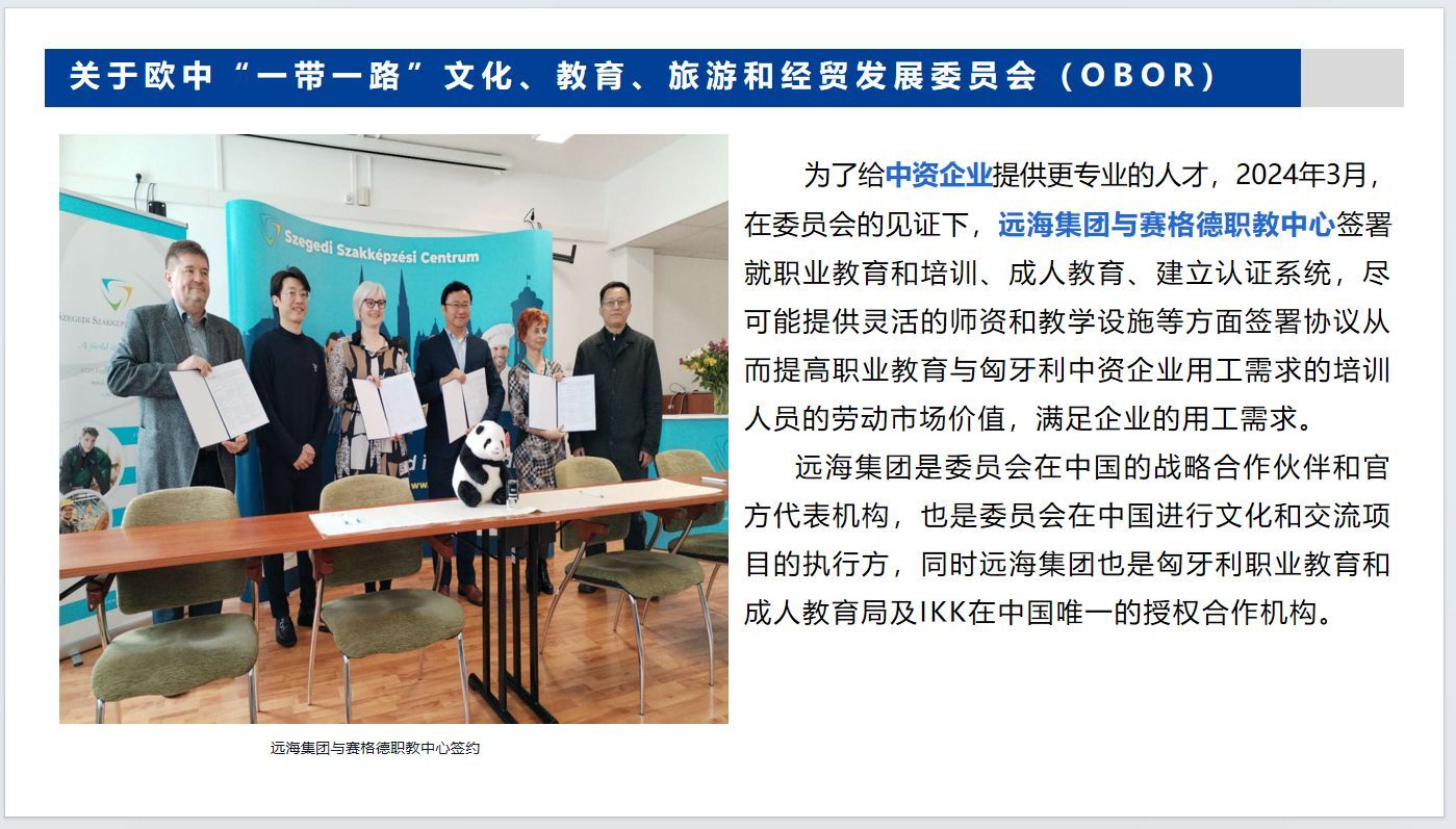 为了给中资企业提供更专业的人才,2024年3月,在委员会的见证下,远海集团与赛格德职教中心签署就职业教育和培训、成人教育、建立认证系统,尽可能提供灵活的师资和教学设施等方面签署协议从而提高职业教育与匈牙利中资企业用工需求的培训人员的劳动市场价值,满足企业的用工需求。