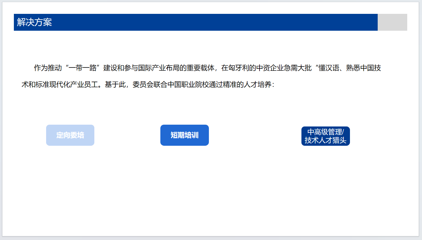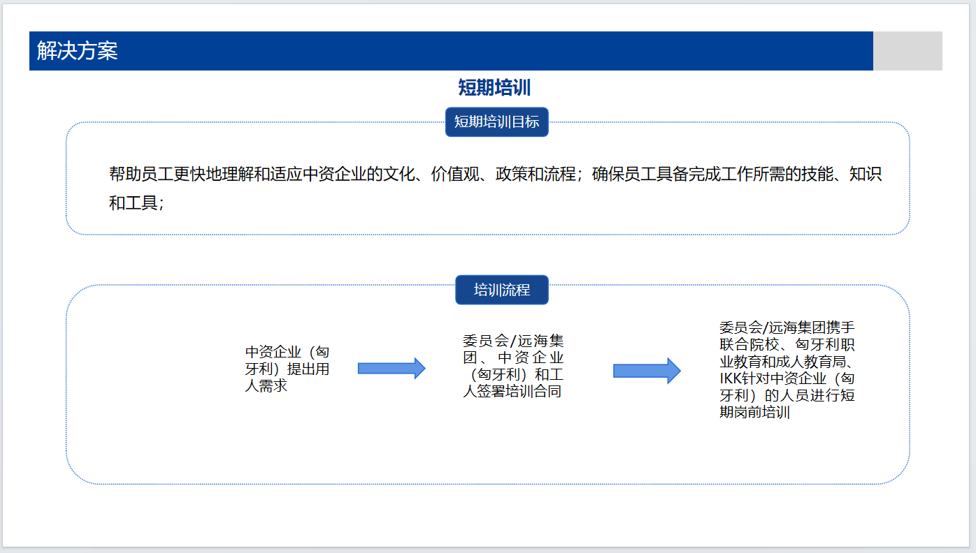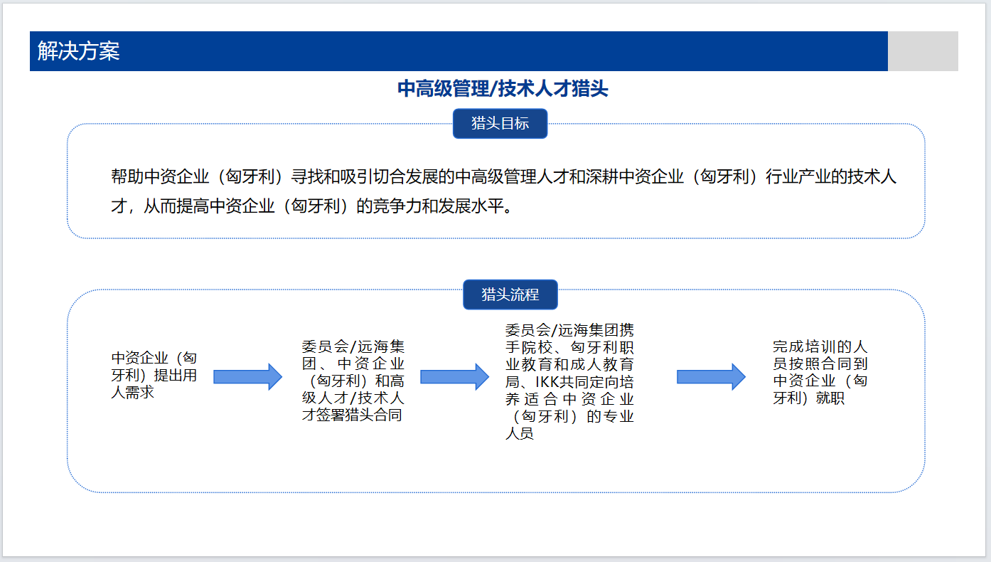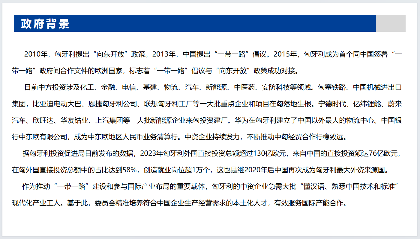 为了给中资企业提供更专业的人才,2024年3月,在委员会的见证下,远海集团与赛格德职教中心签署就职业教育和培训、成人教育、建立认证系统,尽可能提供灵活的师资和教学设施等方面签署协议从而提高职业教育与匈牙利中资企业用工需求的培训人员的劳动市场价值,满足企业的用工需求。