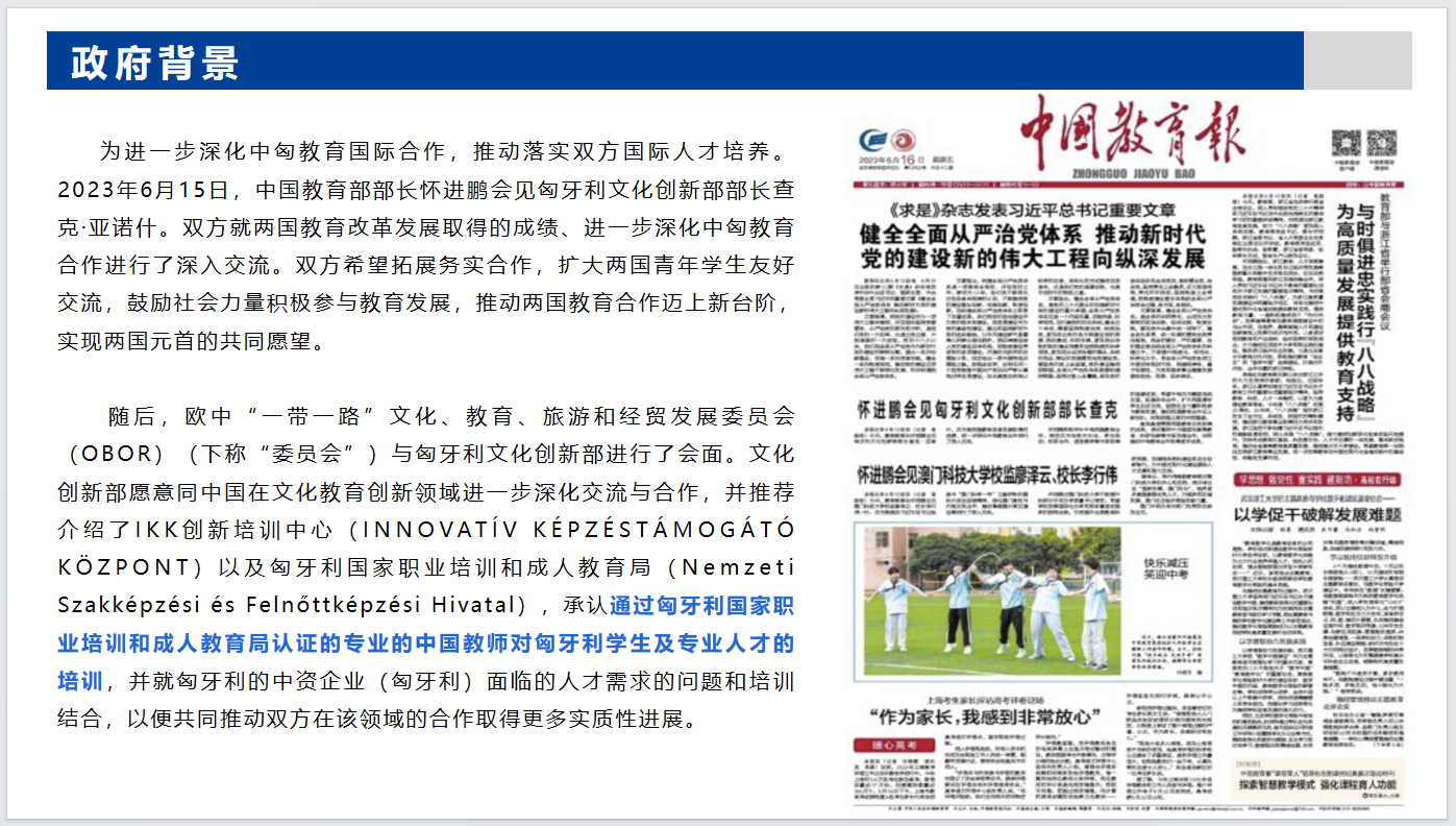 远海集团是委员会在中国的战略合作伙伴和官方代表机构,也是委员会在中国进行文化和交流项目的执行方,同时远海集团也是匈牙利职业教育和成人教育局及IKK在中国唯一的授权合作机构。