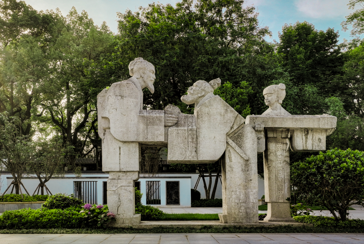 5月12日,武汉汉阳古琴台景区内的伯牙、子期雕像。图/中新社