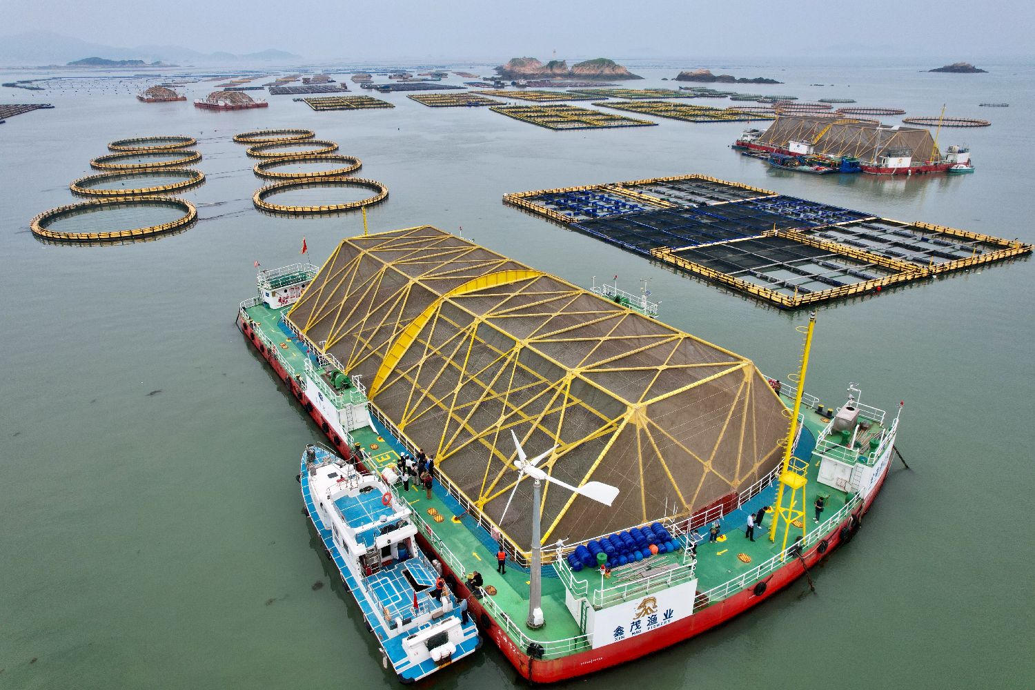图为位于福建省福州市连江县海域的深水网箱、渔排及深远海养殖平台。