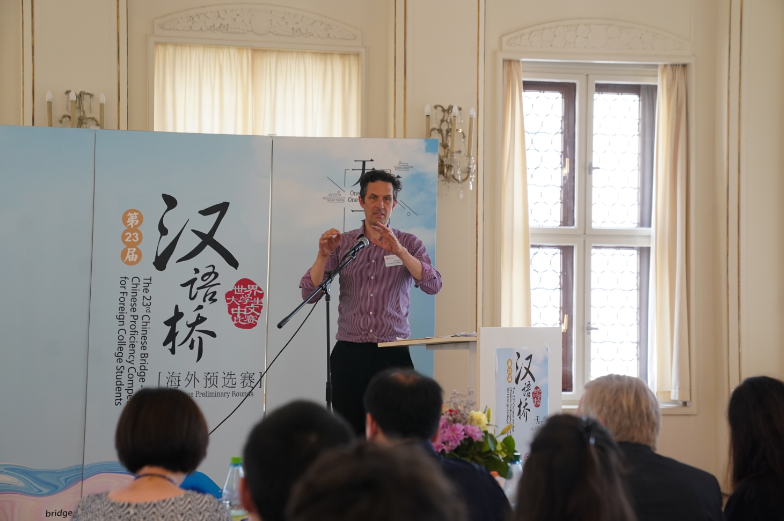 5月25日,田亚明主持第二十三届“汉语桥”世界大学生中文比赛德国区决赛。图/中新社