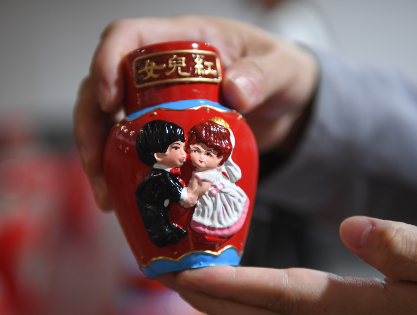 5月25日,浙江绍兴上虞,工作人员展示婚庆主题的绍兴黄酒产品。图/中新社