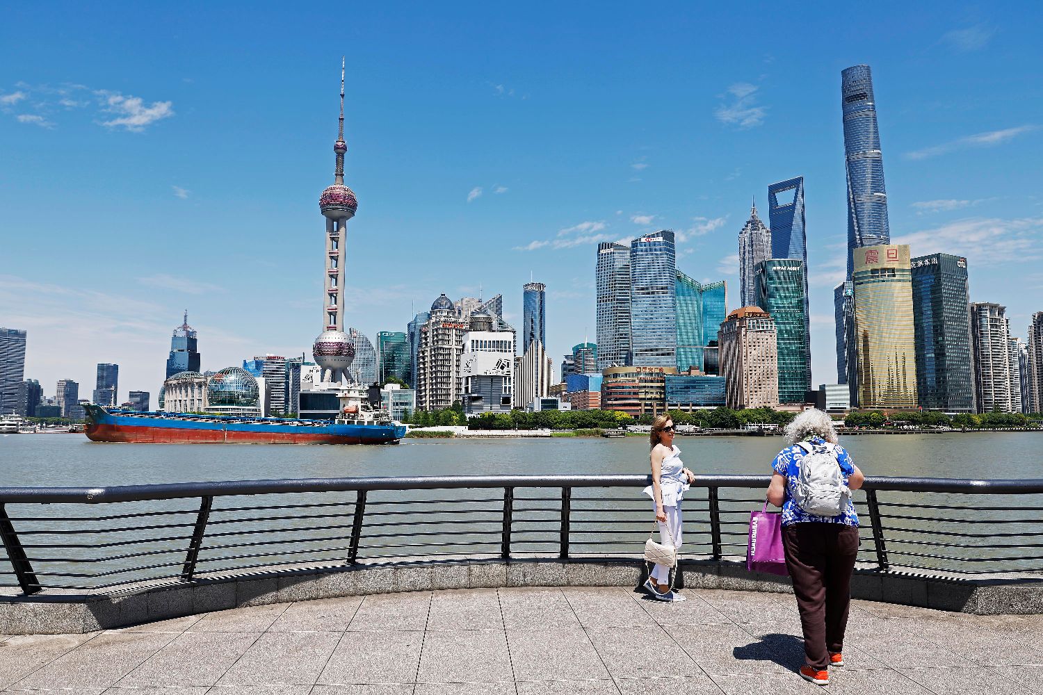 6月2日,上海天气晴好,外籍游客在外滩滨江步道游览。图/中新社
