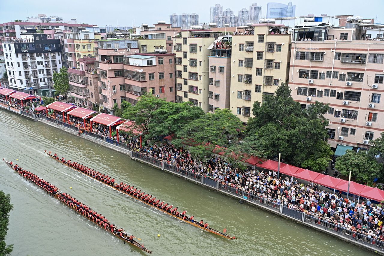 6月5日,“2024一水同舟·车陂端午龙舟盛会”在广州车陂涌内举行。图/中新社