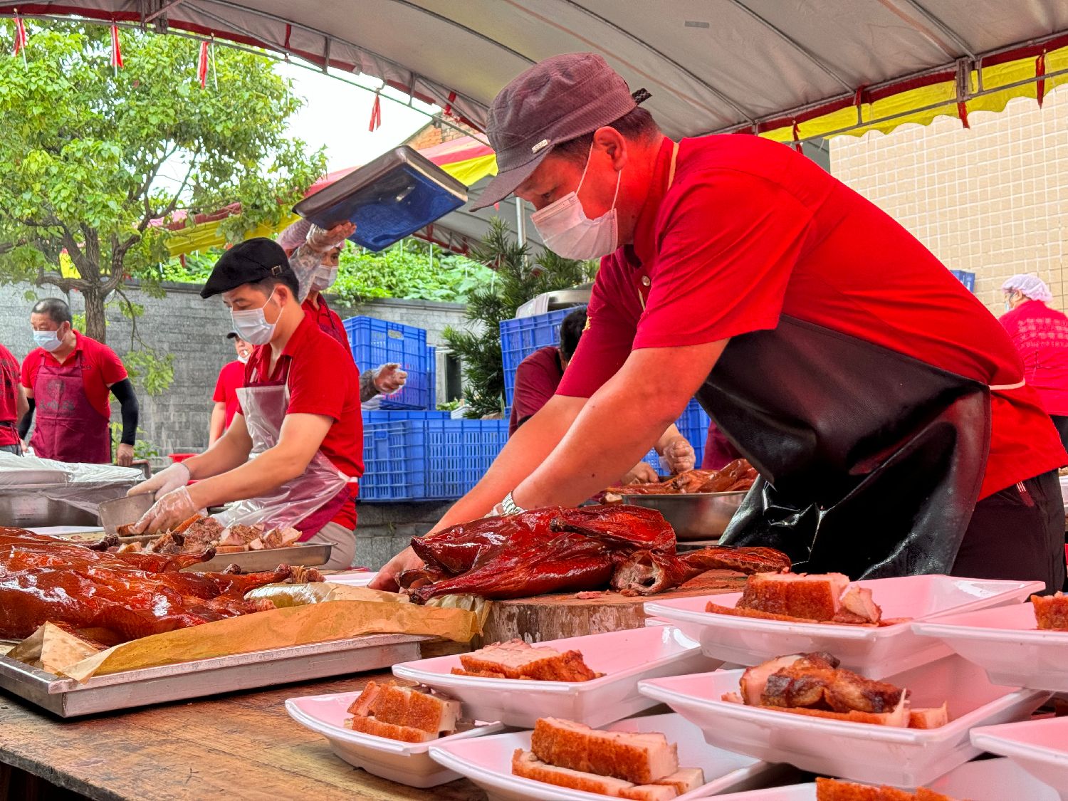 在白云区人和镇流溪河蚌湖河段畔,逾500张圆桌餐台整齐摆开,乡亲们围坐在餐桌旁,一边讲述着龙舟饭的寓意和传统,一边聊着家常;厨师们各司其职,在炉灶前挥舞着炒铲,烹饪出一道道美味佳肴。