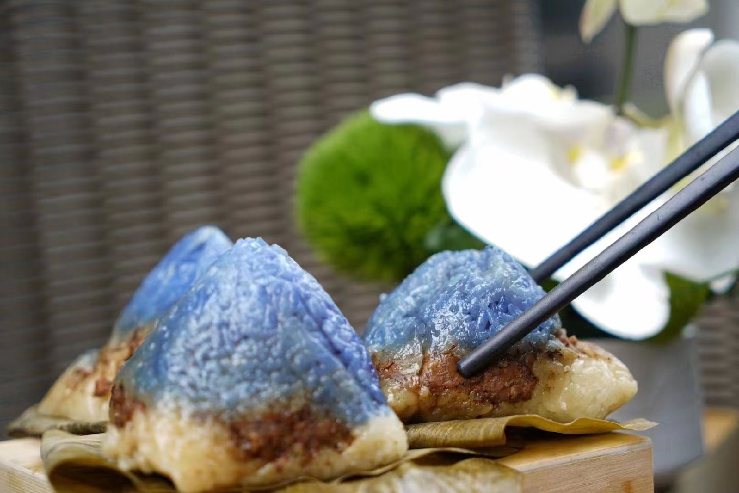 今年是马来西亚华人温贵新在中国生活的第16个年头,每到端午时节,最让他念念不忘的就是家乡的娘惹粽。温贵新告诉记者,娘惹粽是娘惹峇峇族群在中华饮食习惯基础上融合南洋风味做出的特色美食,其制作工艺繁琐,“馅料里有板栗、红葱头、梅头肉、花菇等食材,除粽叶外,还会用香兰叶包裹,最有特色的还是用蝶豆花染成的蓝色糯米和用各类香料调制的独特风味。”