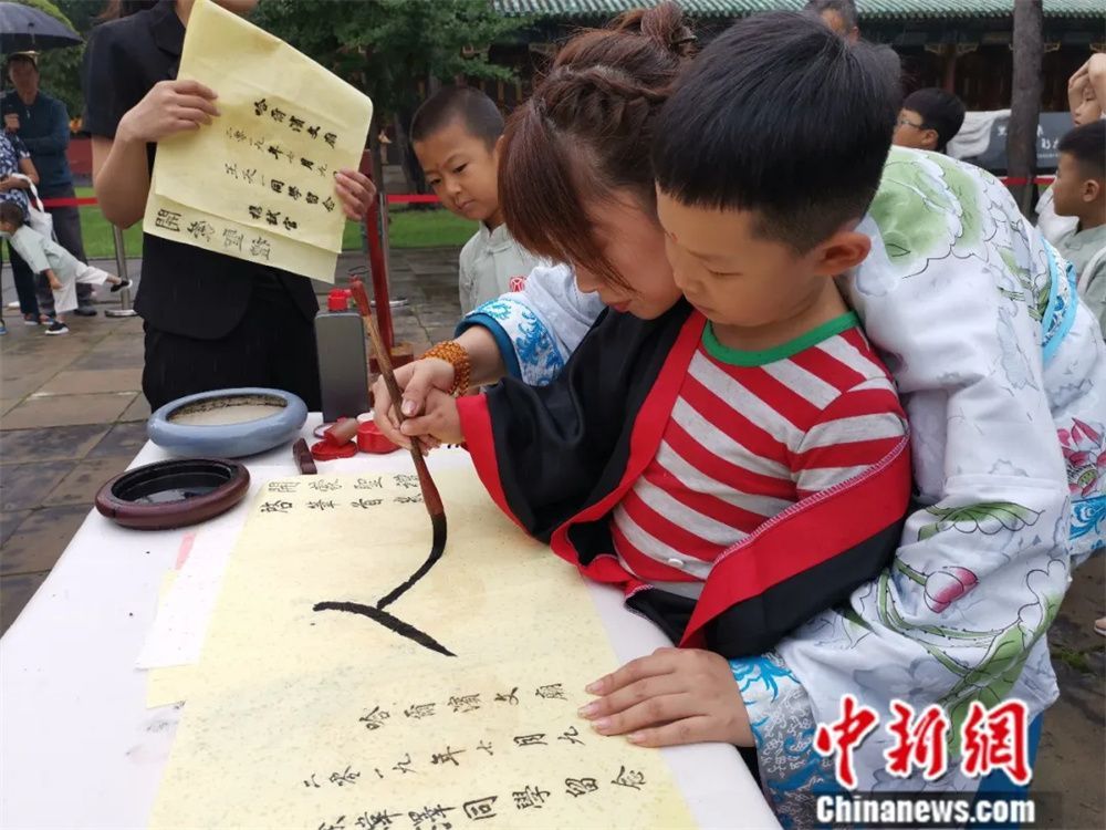 学龄前儿童在哈尔滨文庙参加“开蒙礼”,孩子在老师的帮助下开笔写字。图/中新网