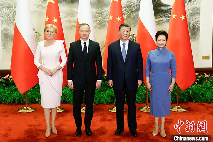 6月24日下午,中国国家主席习近平在北京人民大会堂同来华进行国事访问的波兰总统杜达举行会谈。会谈前,习近平和夫人彭丽媛同杜达和夫人阿加塔合影。中新社记者盛佳鹏摄