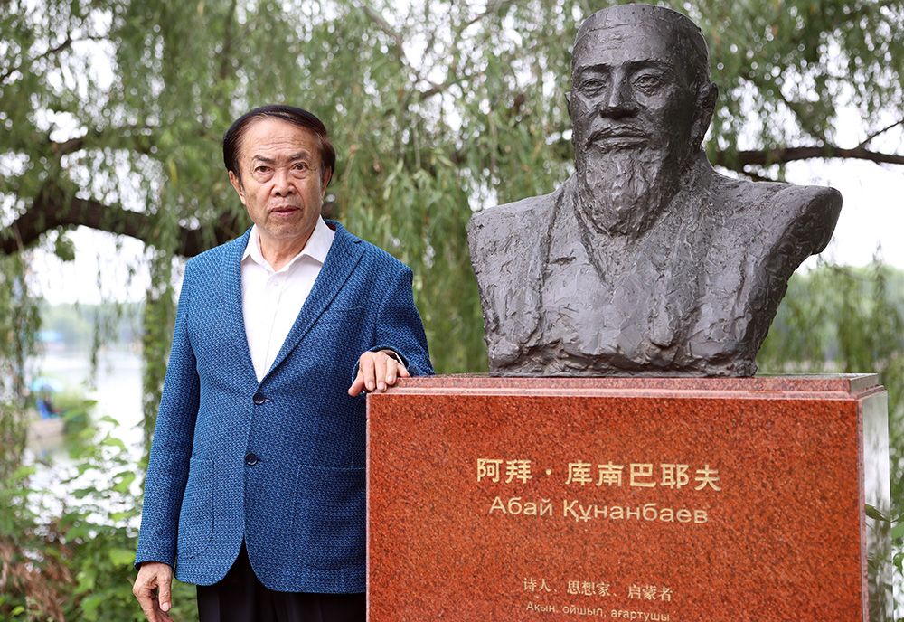 7月2日,北京金台艺术馆馆长、知名雕塑家袁熙坤与其创作的阿拜·库南巴耶夫的雕像合影。图/中新社