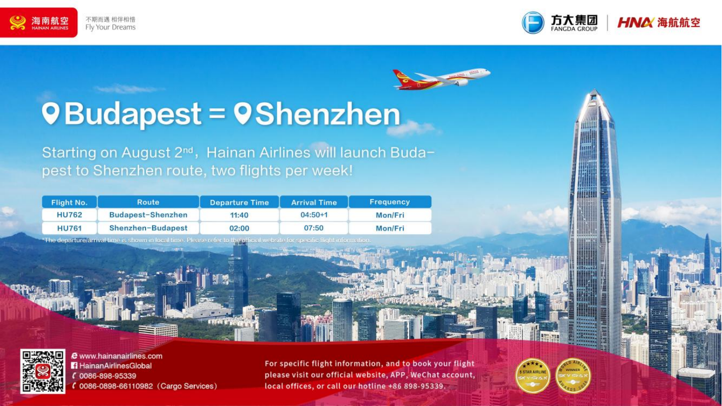2024年7月17日,布达佩斯—本报讯(通讯员吴波、戴宛珊 作者单位:海南航空控股股份有限公司)海南航空计划于8月2日起开通布达佩斯—深圳直飞国际航线,这是首条匈牙利直飞深圳的客运航线,也是海南航空在深圳出港的第十条国际航线。2004年8月2日凌晨1时20分,海南航空一架波音豪华客机满载着中外旅客从北京首都国际机场起飞,飞向“东欧古城”布达佩斯,海航首条跨洲际定期航班正式开通。时隔20年,海南航空布达佩斯直飞深圳航线的开通,将为往返中东欧和中国之间的旅客提供更多出行选择,为中匈关系发展注入新动力。